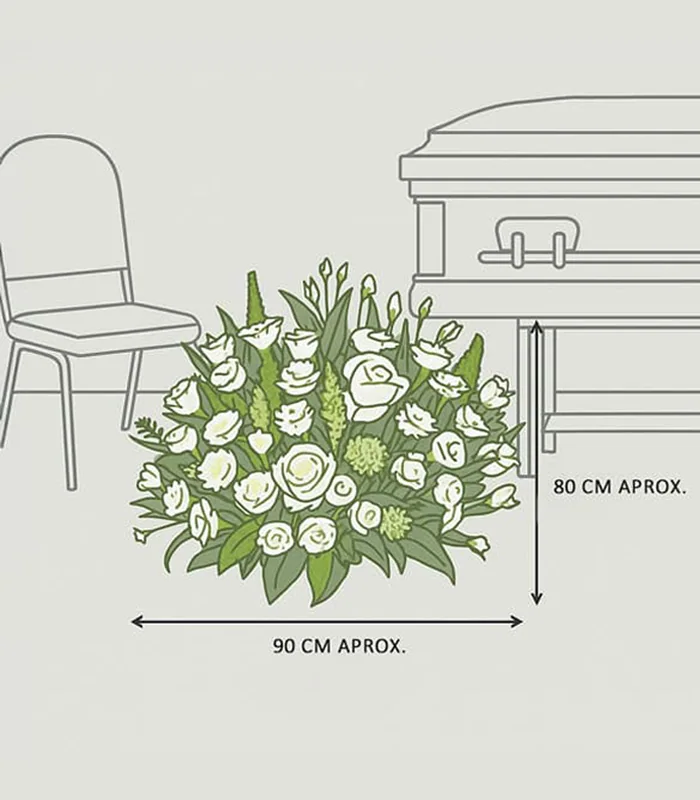El arreglo floral de condolencias más pedido. Expresa tus condolencias con este elegante arreglo floral, diseñado para ofrecer consuelo y apoyo en momentos de pérdida. Diseño de un solo frente para colocar al pie del ataúd.